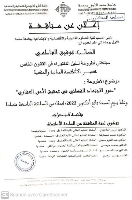 ويتقدم بهذه الأطروجة لنيل لقب “دكـــتور” الطالب الباحث “تــــوفيق فاطمي” المستشار بمحكمة الاستئناف بـــوجدة.