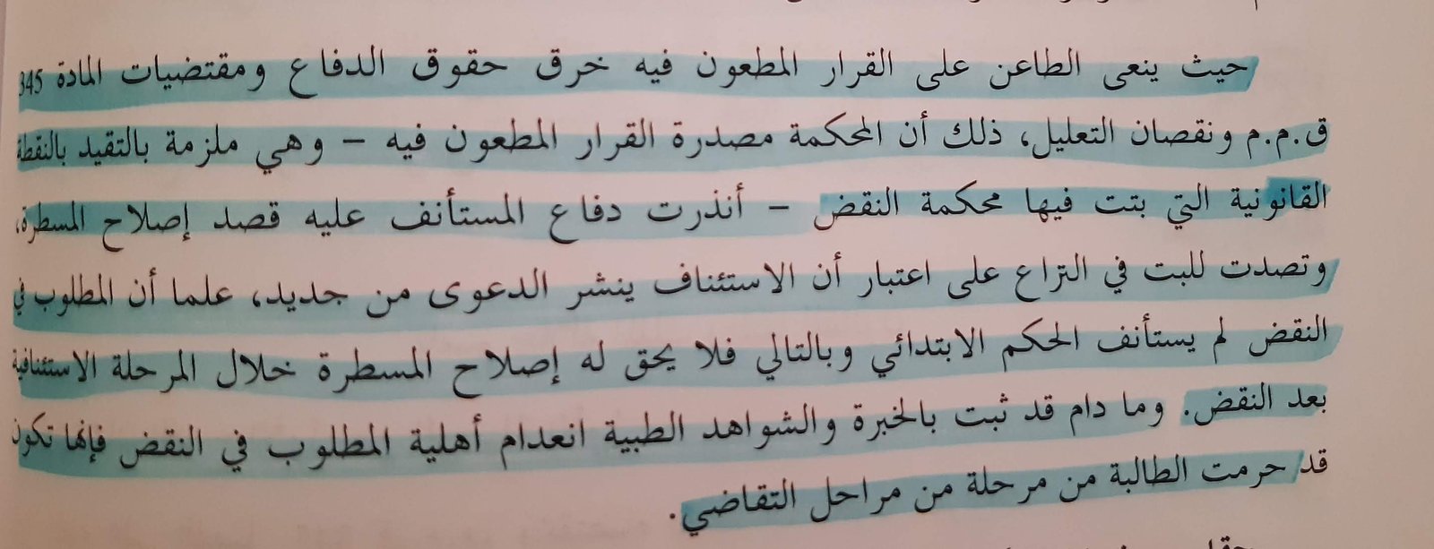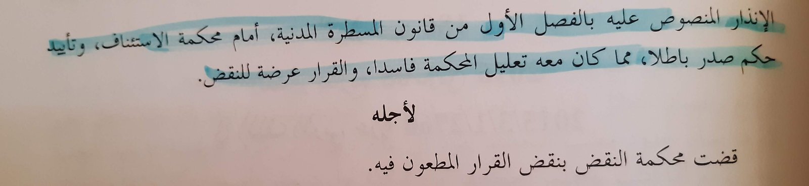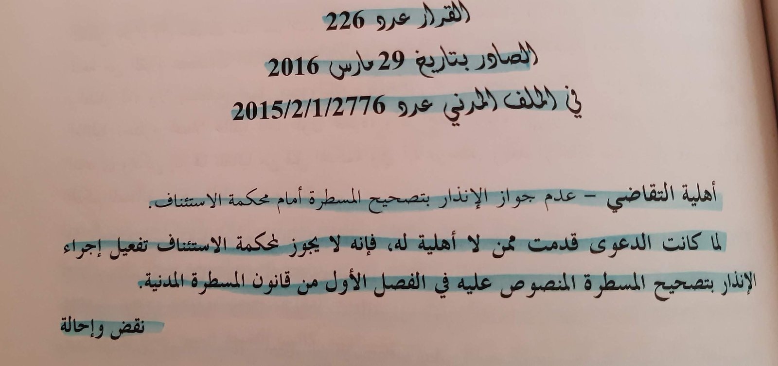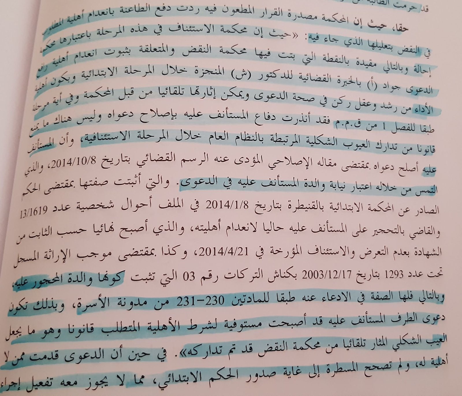 وقد أيدت محكمة النقض هذ الدفع جزئيا، فهي لم تنفي أن المدعي في شخص والدته بعد أن تحصلت على دعوى الحجر على ابنها قد استوفت شرط الأهلية المتطلب قانونا أثناء المرحلة الاسثئنافية للدعوى، مما يجعل العيب الشكلي المثار تلقائيا من طرفها قد تم تداركه. لكنها آخذت عليه أنه أثناء رفع الدعوى ابتدائيا لم يتوفر فيه شرط الأهلية، ولم تصحح المسطرة إلى غاية صدور الحكم الابتدائي. مما لا يجوز معه تقعيل إجراء  الإنذار المنصوص عليه في المادة 1 أعلاه من م .م أمام محكمة الاستئناف، مما يعد تأييدا لحكم صدر باطلا، ولهذا اعتبر تعليلها فاسدا..